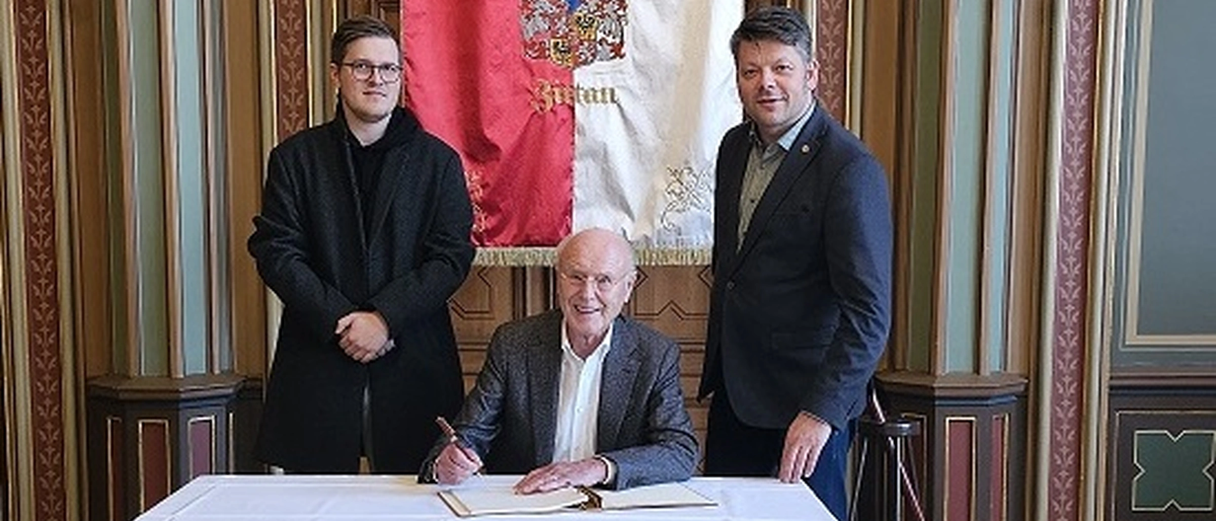 Bruno Höner, Seniorchef und Verwaltungsratsmitglied der Musterring International Josef Höner GmbH & Co. KG aus Rheda-Wiedenbrück, hat in dieser Woche die Stadt Zittau besucht. Gemeinsam mit seinem Enkel, Christopher Höner, der demnächst in vierter Generation in die Unternehmensführung einsteigen wird, hat sich Bruno Höner über den Stand der Zusammenarbeit mit unserem Forstbetrieb informiert. Das Unternehmen Musterring unterstützt bereits seit 1991 die Aufforstung unseres Stadtwaldes mit einem jährlichen Spendenbetrag. Seitdem konnten rund 500.000 Euro vom Städtischen Forstbetrieb für den Zittauer Stadtwald eingesetzt werden. Nachdem anfänglich die Beräumung von Flächen mit Immissionsschäden und die Wiederaufforstung im Fokus stand, sind die Spendengelder seit 2010 in den Waldumbau mit heimischen standortgemäßen Baumarten und Wiederaufforstungsarbeiten auf Borkenkäferflächen eingesetzt worden. Oberbürgermeister Thomas Zenker nutzte den Besuch aus Nordrhein-Westfalen auch, den langjährigen Unterstützer unseres Waldes zu einer Eintragung im Goldenen Buch der Stadt einzuladen. „Diese Partnerschaft mit dem Möbelhersteller Musterring ist etwas ganz besonderes und wir sind für das anhaltende große Engagement sehr dankbar. Das Unternehmen sorgt sich nicht nur um die Rohstoffe für seine Produkte, sondern sieht auch die Zusammenhänge im Sinne der Nachhaltigkeit. Andere Beispiele, wo freiwillig schon so früh und so konsequent in dieses wichtige Thema investiert wurde, sind äußerst selten“, sagt Oberbürgermeister Thomas Zenker.